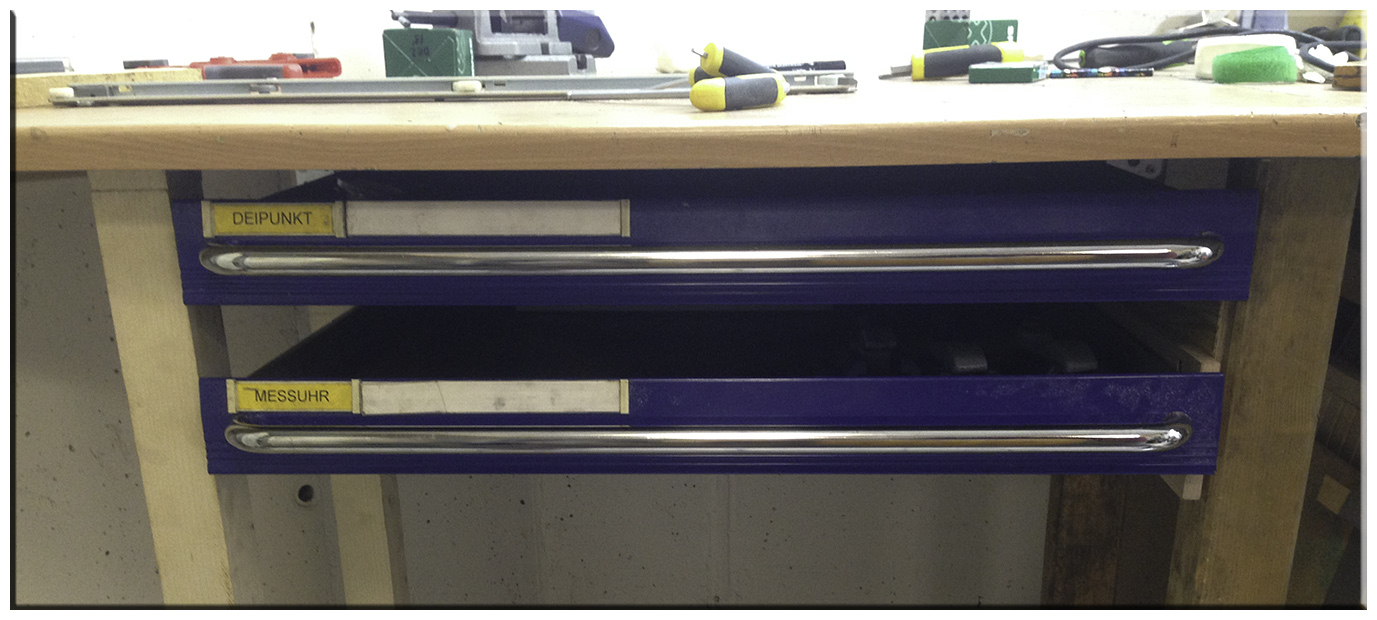 I vores sommerferie i Niederkassel fik jeg nogle gamle værktøjsskuffer som Thomas selv havde håbet at kunne bruge. Men da han ikke havde fået monteret dem spurgte han om det var noget for mig, og det var det da, så nu sidder de under mit arbejdsbord. Det var ikke helt let for da de blev afmonteret på Thomas arbejde fik den lærlinge der gjorde det smidt en af skinnerne væk, så den måtte jeg bygge af træ. Det gik dog, så nu er der mere orden hos os.